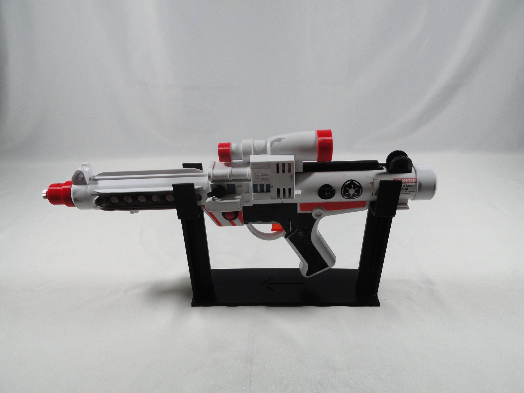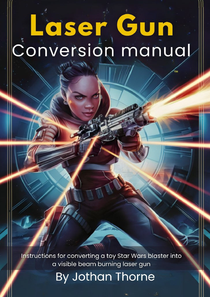This Storm Trooper Blaster conversion kit allows you to retrofit a Hasbro Storm Trooper Blaster toy gun with a HOT 7 Watt blue laser and a 5mW green targeting laser. Fully illustrated manual (PDF) with all parts required to produce a working laser gun. You provide the Storm Trooper Blaster toy for conversion. This kit requires minimal soldering and is considered medium skill. The sound effects are synchronized with the laser blasts. It uses the standard AA batteries in the handle for the sound effects circuit and green laser, and a separate 7.4V li-ion internal battery for the blue laser. Includes a charge port, charger and separate enable switch for the blue laser. THIS IS NOT A TOY! YOUR END PRODUCT WILL BE A REAL LASER GUN!